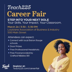 Teach225 Career Fair!!! Step into your next role with Teach225! Meet with schools, discuss certification programs—plus enjoy free food and prizes. Teach225 is hosting a FREE, in-person Teacher Career Fair on Thursday, March 26, 2026, from 3:30 p.m. – 5:30 p.m.! This event is your opportunity to connect directly with Baton Rouge’s high-quality public schools that are hiring for the 2026–2027 school year. Whether you’re a certified teacher, aspiring educator, recent graduate, or exploring a transition into the classroom, you’ll be able to: • Meet leaders from top-performing local schools • Learn about open teaching and support roles • Explore certification pathways and educator support programs • Build relationships that could launch your next role Enjoy complimentary refreshments while networking, and enter to win exciting door prizes. (Must be present to win.) Join us downtown at LABI. Free parking is available at St. Joseph’s Cathedral. Have questions? Review our FAQs or contact Jasmine Simmons at jasmine@newschoolsbr.org.